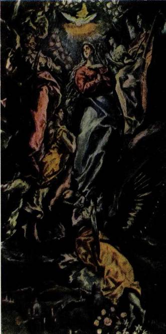 В музее Санта Крус хранится одна из лучших картин позднего периода творчества Греко – а именно «Вознесение богоматери» (1607) из церкви Сан Висенте. Картина прекрасно сохранилась, что не всегда бывает с работами Греко. В этой картине Мария парит среди облаков, как бы гонимая к небу поднимающимся снизу пламенем. Роскошен красно-желтый цвет одежды стоящего слева, с раскрытыми серо-лиловатыми крыльями, большого ангела, которого знаток Греко, Коссио, написавший первый основательный труд о творчестве Греко (1908), назвал христианской Никой Самофракийской. Одежда ангела бросает красноватые отблески на белые, зеленоватые и синие ткани одежд апостолов, придавая им динамичность. На фоне мерцает Толедо – силуэт моста Алькантара, шпиль колокольни собора, направо – лодка, скользящая по водам Тахо. Полон свежести роскошный букет роз и лилий. Богоматерь окружена свитой ангелов, играющих и поющих в ее честь. Рисунок к этой картине хранится в сакристии монастыря св. Магдалины (Толедо). В музее Санта Крус мастерством исполнения привлекает еще ряд картин Греко: «Св. Иосиф с младенцем Христом» замечательны своей душевной проникновенностью; «Благовещение» – нежно лирично; «Непорочное зачатие», выполненное в чистых светлых, с преобладанием голубого, тонах, спокойно. Напряженно драматичен «Христос с крестом». «Явление Христа богоматери», или, как иногда ее называют, «Прощание богоматери с Христом», – картина, полная спокойной ясности, это как бы задушевный, полный взаимного понимания разговор матери с сыном. Здесь нет ни одной посторонней фигуры, ни одного лишнего аксессуара. Вопреки своей привычке Греко ни разу не возвращался к этому сюжету.