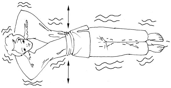Теперь положите ладони под шейные позвонки, локти тяните к лицу, а ноги соедините вместе. Пальцы ног тяните к себе. В этом положении начинайте вибрировать всем телом, как рыбка, справа налево (рис. 1).