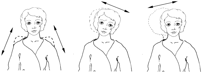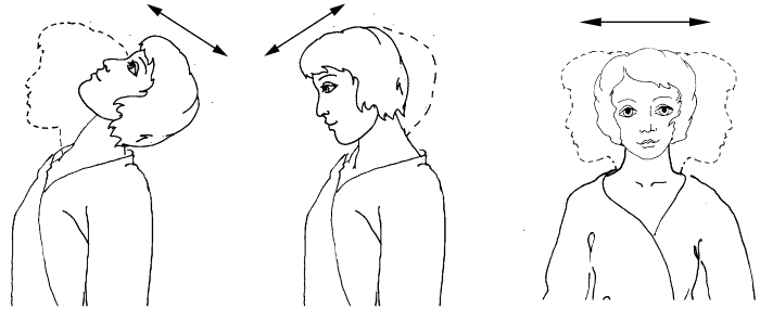 Медленно поворачивайте голову влево, приблизительно на треть расстояния до плеча. Медленно поворачивайте голову еще раз влево, но немного дальше. Медленно поворачивайте голову третий раз влево, еще дальше. Повторите то же самое вправо.