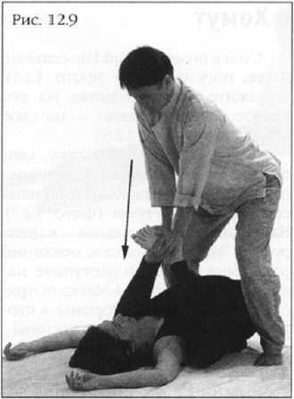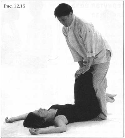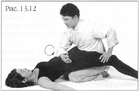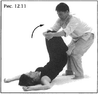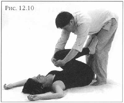 Согните ноги партнера, соединив колени и зажмите их между ваших ног. Стопы подсуньте под его ягодицы. Держа спину и руки прямо и покачиваясь из стороны в сторону, поочередно надавливайте ладонью то на одно, то на другое колено, прижимая поясницу и крестец к коврику (фото 12.13).
