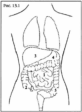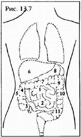 1, 2 – Пупок и тонкий кишечник; 3, 4 – Восходящая ободочная кишка; 5 – Почки; 6 – Печень; 7 – Поперечная ободочная кишка; 8 – Селезенка и желудок; 9 – Нисходящая ободочная кишка; 10 – Почки; 11 – Нисходящая оболочная кишка