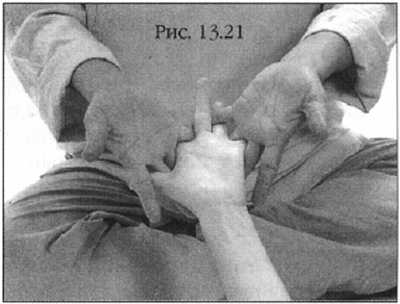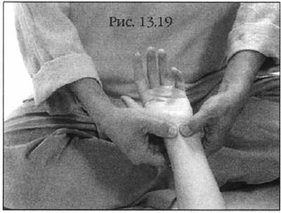 Затем переплетите ваши пальцы, растягивая в длину и ширину ладонь (фото 13.19). Массируйте ее большими пальцами.