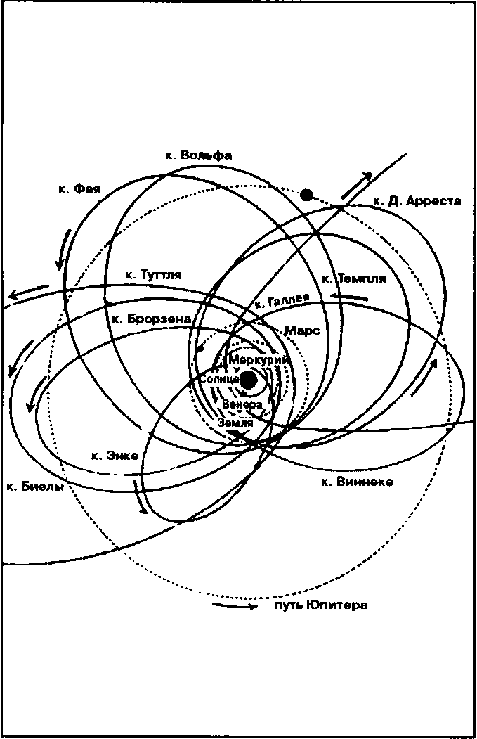 Все кометы, кружащиеся около Солнца, описывают в пространстве подобные этому невидимые пути, представляющие более или менее растянутые эллипсы, в которых лучезарное дневное светило занимает один из фокусов. Их очень много. Следующий наш рисунок дает понятие о том, как пересекают кометы путь нашей Земли около Солнца, равно как и пути других планет. Всякий, кто обратит внимание на эти пересечения, легко поймет, что столкновение земли с кометой не представляет ничего невозможного или невероятного.