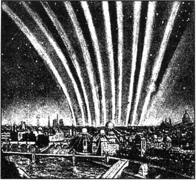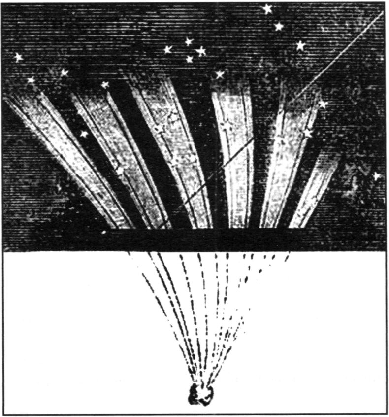 Но вот вновь блеснуло Солнце; атмосфера прояснилась, тучи рассеялись, снова показалось голубое небо; однако все не без тревоги ждали в этот день заката солнца. С наступлением ночи все взоры обратились к небу, отыскивая на нем страшное светило. И что же? Кометы в том классическом, так сказать, виде, к которому все привыкли, не оказывалось больше на небе; к общему изумлению ее заменило какое-то особенное северное сияние, гигантским веером раскинувшееся по всему небу; громадные ветви его представляли собою семь зловещих зеленоватых лучей, прорезывавших пространство и исходивших как будто из какого-то волшебного костра, разложенного под горизонтом.