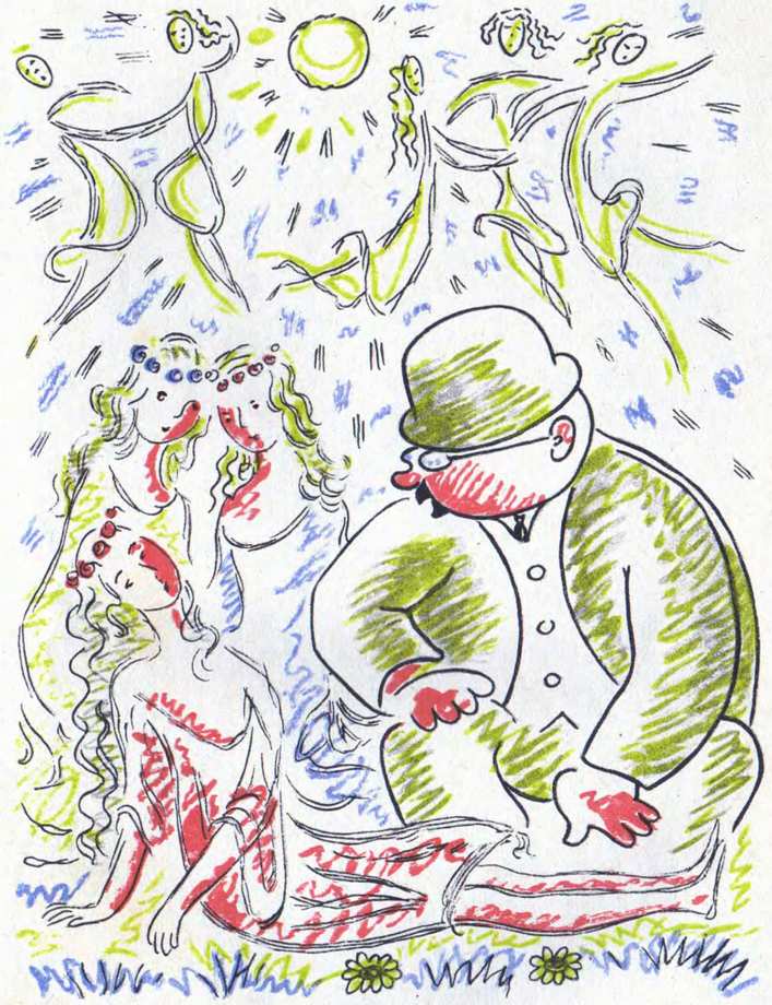 Ну что тут делать будешь? И вот пришлось мне наконец счистить, как кожицу, самый блеск, знаете, такой металлический отлив, что бывает на крыльях стрекозы. Сделал я из него две шинки, а лунный луч в капельке росы разделил на семь цветов радуги и самым тоненьким – синим – лучиком привязал эти шинки к сломанной русалкиной ножке. Такая была каторжная работа, что я даже вспотел – лунный свет мне казался жарче августовского солнца!