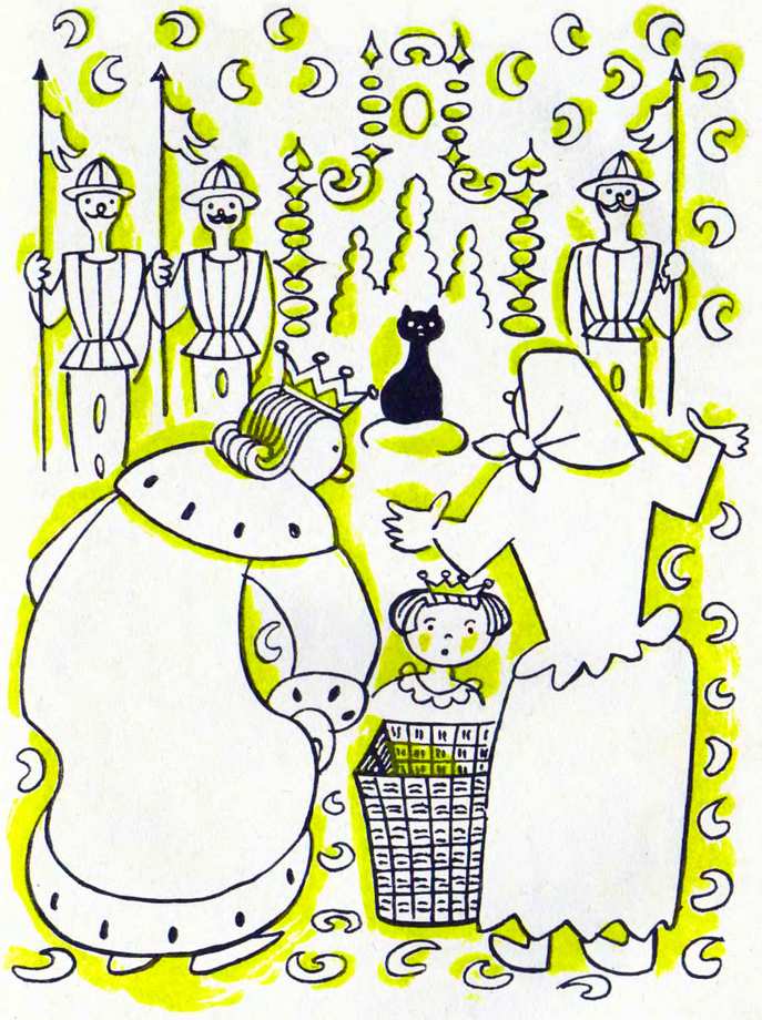 Наконец сняла старушка платок. Из корзины выскочила чёрная кошка и одним прыжком взлетела прямо на королевский трон.
