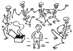 Наконец скелеты покинули свои убежища, взялись за руки и пустились в пляс вокруг перепуганного Шимандла.