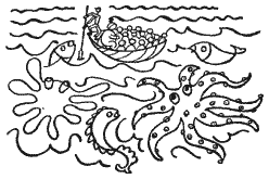 Рыбы высовывались из воды и кровожадно разевали зубастые пасти, а морские чудища протягивали длинные щупальца, стараясь схватить кого-нибудь из смелых путешественников и утащить в пучину.