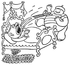 Кругом была кромешная тьма, и Францимор не знал, где он. Бедняга так устал, что еле стоял на ногах, и хотел поскорее устроиться на ночлег. Шаря в темноте одной рукой (в другой он держал свой дорожный чемоданчик), наш герой вскарабкался на ложе, где почивал король. Огромный рот короля был раскрыт, и Францимор залез в него, решив, что это открытая дверь. Только удивился, как там влажно и тепло.