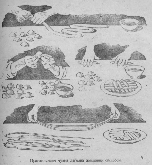 ШИМАПриготовить лапшу, как указано в рецепте «Чузма лагман», но сделать ее еще тоньше и отварить в соленой воде. Для подливы обжарить мелко нарезанное мясо, положить лук и нарезанный чеснок, продолжать жарить. Добавить томат или помидоры и немного уксуса, подлить воды, дать закипеть.