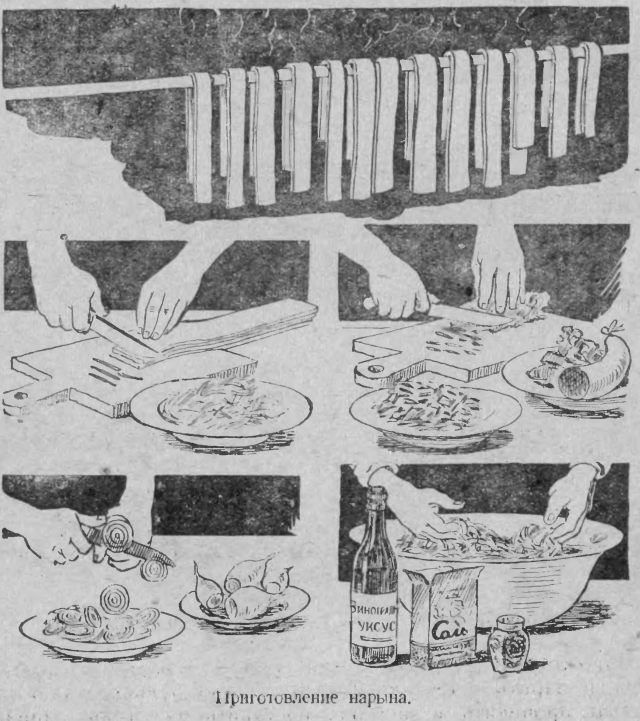 Растопить в кастрюле сало, затем положить мясо, мелко нашинкованный лук, жарить пока не зарумянится. После этого налить воды, посолить, заправить специями и кипятить. Через 7-8 мин. положить подготовленное тесто.