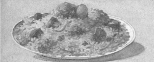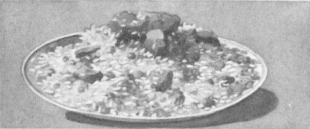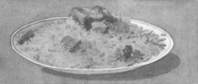 [Закрыть]. Затем рис переложить в мешочки и дать стечь воде. Очистить морковь и в целом виде отпарить вместе с мясом. Вареное мясо нарезать кусками, а морковь – соломкой, все перемешать, добавить немного соли, молотого черного или красного перца. В сильно раскаленном жире пережарить лук. Когда лук подрумянится, вынуть из котла и смешать его с мясом и морковью.