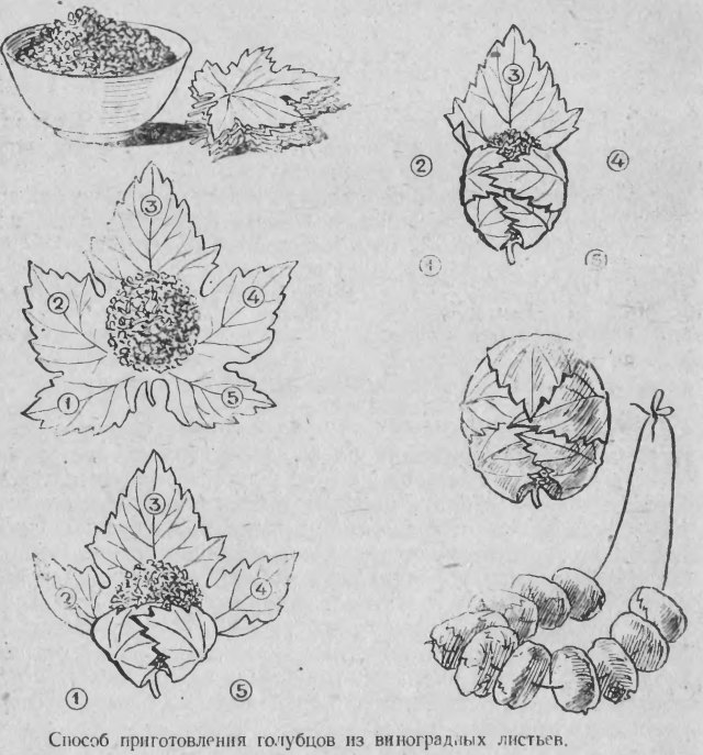 Мясо, предназначенное для плова, разделить на две части; одну часть нарезать для поджарки, из другой – вместе с луком приготовить фарш. Выбрать молодые листья винограда, ополоснуть в холодной воде. Разложить на каждый листик по одной чайной ложке приготовленного фарша и сделать мелкие голубцы. Чтобы голубцы не разворачивались, их надо уложить на доску вниз швом. Когда будут готовы все голубцы, нанизать их иглой на нитку, положить в отдельную посуду с водой, прокипятить.
