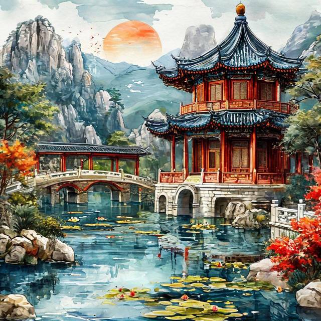 Оформление у всего этого – залюбуешься. Закатное солнце над горами, водоем с лотосами, острые кончики крыш. И горький детский плач.