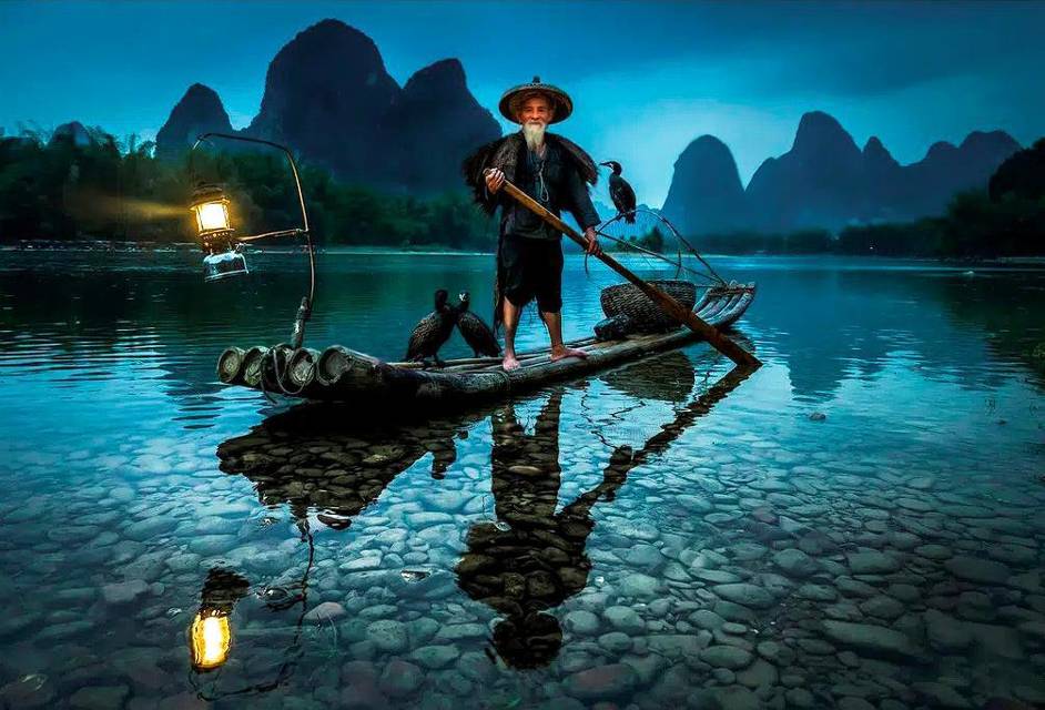 Старенький китаец на плоту везет пернатых пассажиров. Они же средства добычи рыбы – бакланы. Неторопливо толкает плот по течению. Бакланы в какой-то момент взлетают с транспортного средства.