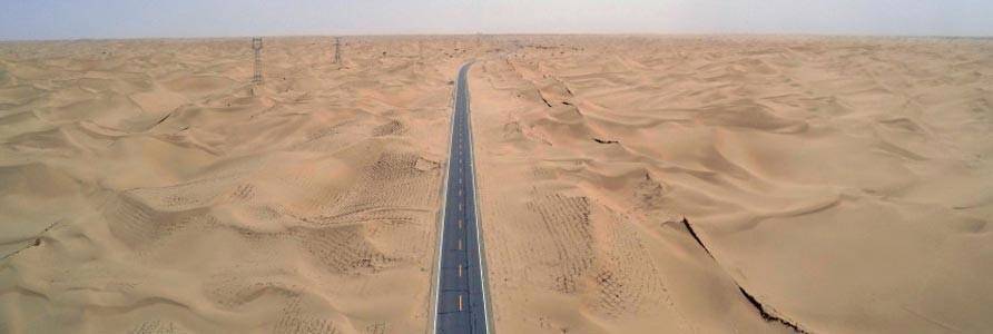 Стабилизацию песков по краям дороги в пустыне Такла-Макан. Таримское шоссе – важная магистраль, проходящая по безлюдной местности, в море постоянно движущихся песков.