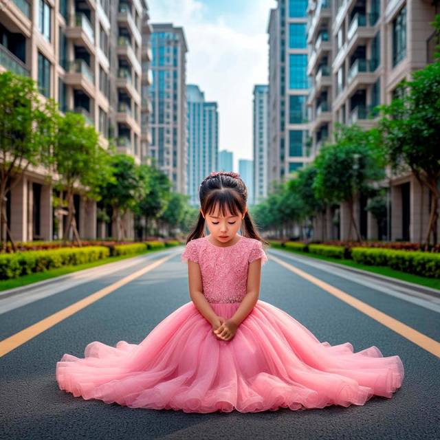 Бежит по асфальту, пока нога не подкашивается, девочка в розовом платье.