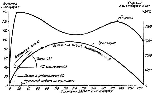 Сама механика полета самолетов может стать в будущем очень непохожей на принятую в настоящее время и приблизиться к артиллерийской. В настоящее время двигатель самолета, как известно, работает в течение всего времени полета, тогда как двигатель реактивного снаряда работает лишь в течение короткого промежутка времени – при запуске-выстреле. Установка на самолете ракетного двигателя, имеющего большую тягу, позволяет осуществить полет самолета по образцу полета снаряда. В этом случае двигатель самолета работает лишь короткое время при взлете, осуществляя разгон самолета до очень большой скорости и забрасывая его, подобно снаряду, на огромную высоту. Дальнейший полет самолета осуществляется с остановленным двигателем, так что топливо не расходуется, причем самолет совершает длительный планирующий полет с постепенным снижением. Расчет показывает, что самолет в состоянии пролететь при этом гораздо большее расстояние и совершить такой полет в значительно меньшее время, чем существующие сейчас самолеты любых типов.