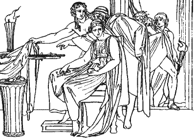Все переносил царь с величайшим терпением, но в душе сгорал от негодования и ждал приближения минуты мщения. Пенелопа, решившись, наконец, предложить искателям ее руки окончательное условие, вошла со своими прислужницами в залу и сказала: «Слушайте! В оружейной лежит любимый лук моего супруга Одиссея с колчаном, наполненным стрелами. Он без труда, пустив издали стрелу, попадал в ушки двенадцати железных секир, поставленных одна за другой. Предлагаю вам завтра испытать эту игру, и кто попадет, подарки того я принимаю и соглашусь стать его супругой, чтобы не расхищалось таким постыдным образом имущество моего благородного сына Телемаха.