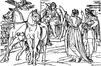 Остальное мясо было тут же изжарено на завтрак присутствующим. Пришел и Телемах, которого младшая дочь Нестора между тем вымыла в бане, умастила и одела в тунику и плащ. В стоявшем посередине большом медном котле было налито вино с водой, и из него каждый почерпнул себе полную чашу и пил ее с обычными обрядами. Затем стали готовиться к отправлению Телемаха. Была заложена колесница, ключница положила в нее съестные припасы, и затем в нее сели Телемах и младший сын Нестора, Писистрат. Писистрат взял в руки вожжи и пустил лошадей. Вечером прибыли они в Феры и переночевали там. Следующим вечером они приехали в Спарту и безмолвно остановились у ворот дворца знаменитого Менелая.