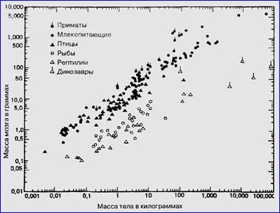 Рис. 4. Диаграмма, показывающая разброс величин «отношения массы мозга к массе тела» для приматов, млекопитающих, птиц, рыб, рептилий и динозавров