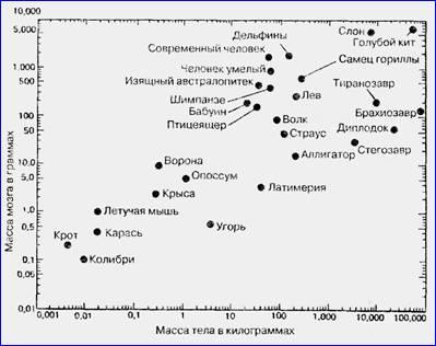 Важность отношения массы мозга к массе тела осознавалась еще Аристотелем. В наше время более других для разработки этой идеи сделал Гарри Джерисон, нейропсихиатр из Калифорнийского университета в Лос-Анджелесе. Джерисон указывает, что существует несколько исключений к установленной ранее корреляции: например, мозг европейской землеройки имеет массу 100 миллиграммов, а тело ее – 1,7 грамма, и отношение этих величин близко к его значению у человека. Но мы не имеем права распространять обнаруженные закономерности на самых мелких из животных, поскольку простейшие «домашние» заботы, возложенные на мозг, требуют некоторой минимальной массы его вещества.