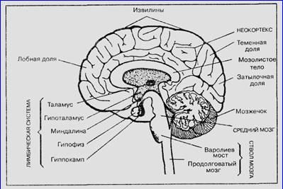 Рис. 10. Схематическое изображение продольного разреза человеческого мозга, в котором большую часть занимает неокортекс, а меньшую – лимбическая система и ствол мозга, или задний мозг. Р-комплекс не показан.