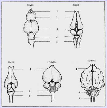 Рис. 6. Схематическое изображение мозга рыбы, амфибии, рептилии, птицы и млекопитающего в их сравнении друг с другом (мозжечок и продолговатый мозг являются частями заднего мозга): 1 – обонятельные луковицы; 2 – передний мозг; 3 – средний мозг, 4 – мозжечок; 5 — продолговатый мозг
