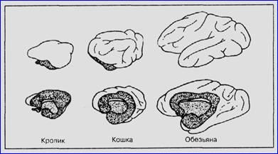 Рис. 8. Схематическое изображение вида сверху и вида сбоку головного мозга кролика, кошки и обезьяны. Темным показаны области лимбической системы, особенно хорошо различимые на видах сбоку. Светлые участки с бороздами – новая кора, хорошо представленная на видах сверху.