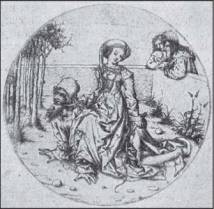 В последней трети XV в. появляется художник, мастерство которого видно на сохранившихся гравюрах на меди. Так как большая часть из его 89 известных листов, изданных Лерсом, находится в Амстердамском кабинете эстампов, его обычно называли «мастером амстердамского кабинета», но ввиду того, что его превосходные рисунки находятся в изданном Эссенвейном «Средневековом домострое» в замке Вольфегге в Швабии, его стали называть «мастером домостроя». Его деятельность охватила последнюю четверть XV в. и первое десятилетие XVI в. Его гравюры на меди прежде всего интересны в отношении техники. Вместе с резцом, которым проводили контуры и получали самые темные тени путем перекрестных штрихов, для более тонкого исполнения он пользовался уже граненой иглой (так называемой холодной иглой), которой слегка касаются медной пластинки и таким образом получают рисунок; благодаря этому достигаются более тонкие переходы от света к тени и более живописное общее впечатление. Его гравюры на меди даже существенно способствовали расширению сюжетов. Его листы еще более, чем листы Шонгауэра, изобилуют фигурами, взятыми из повседневной жизни, но наряду с ними чисто светские сюжеты составляют почти половину его работ. Сколько наблюдательности показывает художник на листах с борющимися крестьянами, играющими детьми, крестьянами, отправляющимися на рынок, надутым волынщиком, семьей цыган, двумя разговаривающими мужчинами и различными любовными сценами! Как фантастичны, словно предвестники беклиновских мотивов, такие его композиции, как «Нагая женщина с детьми верхом на олене», «Дикий человек верхом на единороге» и «Филлида, взнуздывающая Аристотеля» (рис. 378), как глубоко задуманы в то же время такие картинки, как «Юноша и смерть»!