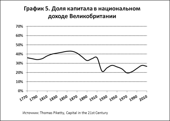 В данной связи возникает вопрос: почему доля капитала в совокупном доходе (пусть и с крупными циклическими колебаниями) снижалась на протяжении двух предыдущих веков? Сегодня в тех странах, по которым доступны исторические данные, эта доля в среднем на 5—10% ниже, чем 200 лет назад (График 5). На протяжении XIX—XX столетий в этих же самых странах наблюдался стабильно высокий коэффициент богатства/доходов (кроме отдельных исторических промежутков) и усиливающийся технологический прогресс, который уже тогда должен был способствовать вытеснению труда капиталом.