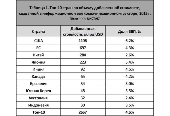 Масштаб проникновения информационного элемента в экономику подтверждают данные о добавленной стоимости, создаваемой в информационно-телекоммуникационном секторе. Даже без учета новых форм организации труда в виртуальном мире эти цифры говорят о том, что информационные технологии стали основой экономического уклада наиболее развитых стран (Таблица 1). Особо подчеркнем, что эти данные дают очень приблизительную картину, так как в приведенных расчетах на долю информационного сектора не переносится экономическая стоимость, создаваемая в результате изменения характера труда и скрещивания рабочего времени со свободным. Такой показатель, если он будет рассчитан, должен значительно увеличить экономический вес деятельности, связанной с нематериальным производством. Косвенным доказательством взрывного роста значения информационного сегмента экономики служит растущая рыночная стоимость мировых локомотивов высокотехнологичного, информационного бизнеса. В июне 2018 года капитализация 5 крупнейших компаний в сфере информационных технологий (Apple, Facebook, Amazon, Microsoft и Google) достигла 3,9 триллиона долларов США, в то время как рыночная капитализация всех компаний, входящих в индекс Dow Jones (объединяет основных индустриальных гигантов США), составила 6,8 триллионов долларов США.