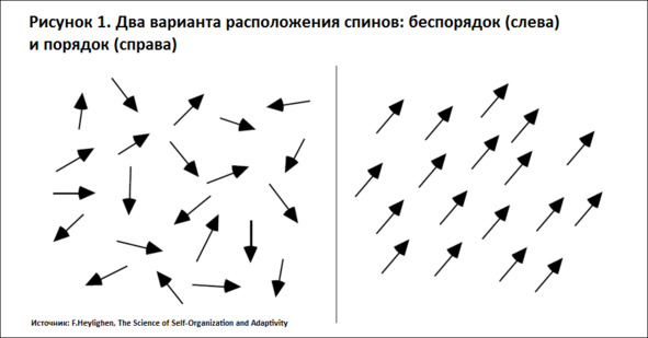 При этом все спины вносят одинаковый вклад в процесс самоорганизации. Может показаться, что начальная группа, давшая толчок самоорганизации, имеет большее значение, чем другие. Однако эта роль могла быть сыграна любой другой группой спинов в результате случайного распределения вероятностей. На практике в процессе магнетизации могут возникать независимые друг от друга группы упорядоченных спинов, конкурирующие за привлечение новых членов. В такой конкуренции, как правило, побеждает группа, выросшая до наибольших размеров, хотя возможно сосуществование нескольких по-разному упорядоченных зон. В любом случае после установления состояния упорядоченности ни одна группа спинов не может его изменить. В этом отношении группа, давшая импульс к самоорганизации, не будет иметь никаких дополнительных преимуществ.