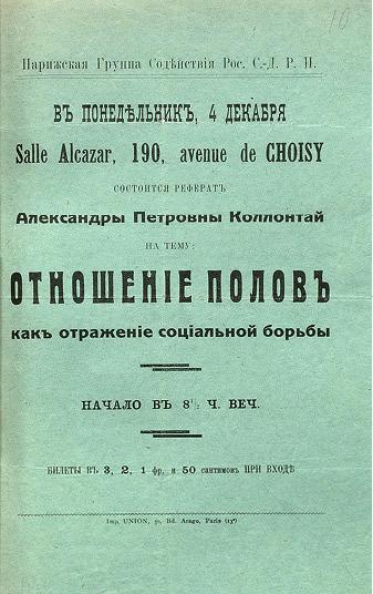 Пока Коллонтай занималась подготовкой к съезду, она боялась, как бы ей не помешали высказаться. Это стало одной из причин, по которой она решила уступить трибуну Волковой. Но еще до съезда она позаботилась о публикации важной работы, в которой раскрывалась суть ее расхождений с феминистками и развивались ее тезисы в целом. Поначалу Коллонтай думала написать небольшой памфлет, но в процессе редактирования ощутила потребность переработать свое произведение в настоящий научный доклад, посвященный женскому вопросу.