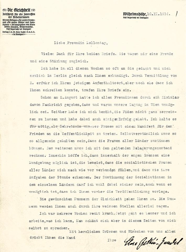 Письмо К. Цеткин на имя А. М. Коллонтай об опубликовании в скандинавской печати воззвания к женщинам мира. 10 ноября 1914. Подлинник. Машинописный текст на немецком языке, подпись – автограф К. Цеткин. [РГАСПИ. Ф. 134. Оп. 1. Д. 424. Л. 1]