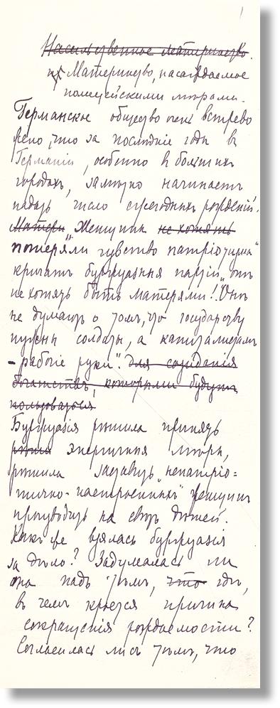Статья А. М. Коллонтай о падении рождаемости в Германии «Материнство, насаждаемое полицейскими мерами». 1914. Подлинник. Автограф А. М. Коллонтай. [РГАСПИ. Ф. 134. Оп. 1. Д. 87. Л. 1–4]
