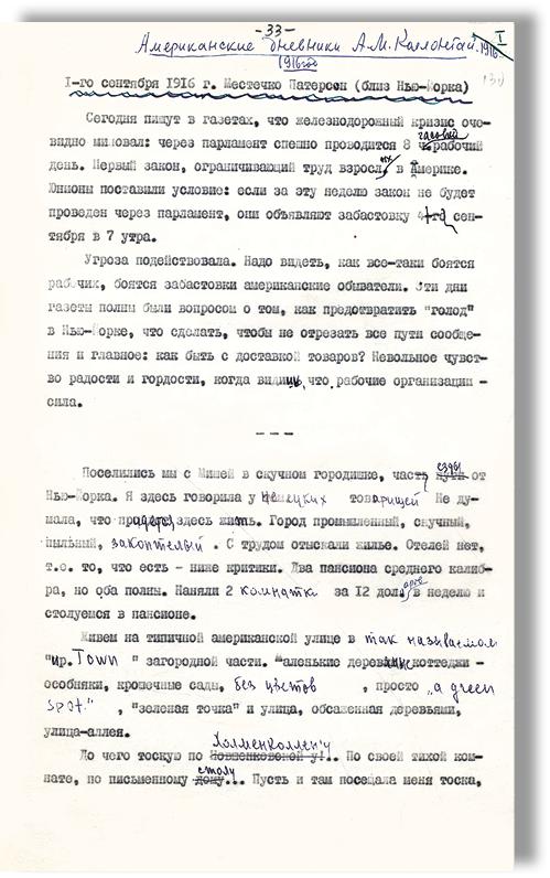 Дневниковые записи А. М. Коллонтай о второй поездке в США. 1916. Подлинник. Машинописный текст с пометками рукой А. М. Коллонтай. [РГАСПИ. Ф. 134. Оп. 1. Д. 102. Л. 130–131]