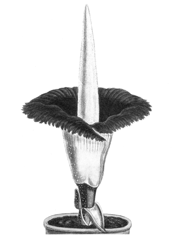 Аронники своим отвратительным запахом мертвечины завлекают мух. Одно из самых известных растений этого семейства – аморфофаллус титанический (Amorphophallus titanum). Это растение семейства ароидных представляет собой огромное соцветие, достигающее трех метров в высоту, – самый большой цветок на свете, как и пальма корифа зонтоносная (Corypha umbraculifera). Эндемик острова Суматра, аморфофаллус источает малоприятный запах разлагающейся плоти, заманивая таким образом опылителей – крупных жуков. Растение не из приятных, повстречавшись с ним, утратишь всякий аппетит. Но от него страдает не так уж много людей, так как это растение довольно редкое и даже занесено в Красную книгу Международного союза охраны природы (МСОП) как находящийся под угрозой исчезновения вид. Его цветение – большое событие! Аморфофаллус цветет редко и недолго, от сорока восьми до семидесяти двух часов, и тогда посетители толпами осаждают ботанические сады. Растение было открыто в 1878 году итальянским ботаником Одоардо Беккари, который и дал растению название, смысл которого вам очевиден… Иногда его зовут просто – пенис титана.