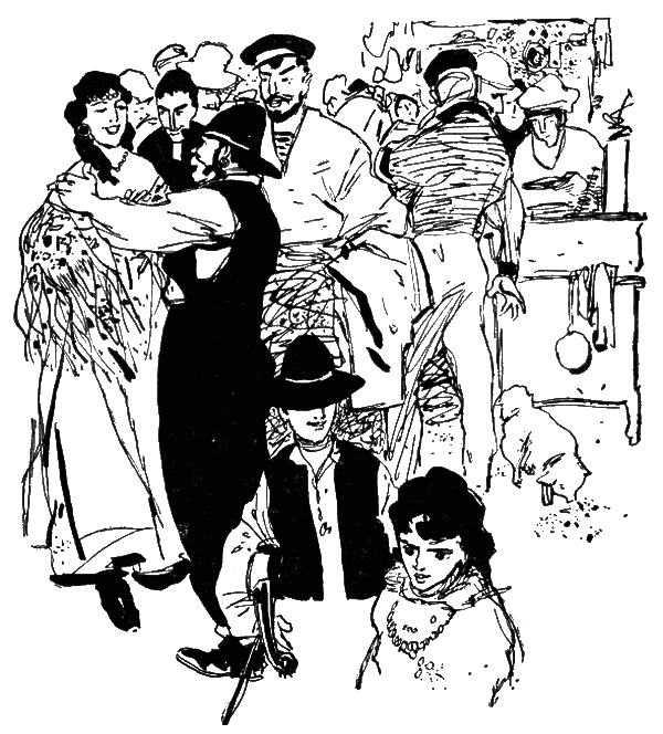 Старуха вошла во двор, села, подняла старенькую скрипку, взмахнула смычком и заиграла танец моряков.