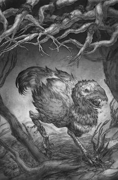 Чудовище шагало на двух огромных сильных ногах; это были ноги птицы, с тремя толстыми когтистыми пальцами, направленными вперёд, и одним, торчащим назад, с крючковатым когтем свирепого вида. Гигантская голова казалась слишком крупной для её туловища; она была вооружена высоким смертоносным клювом. Её мускулистое тело обладало плотными покровами, а крыльев практически не было – всего лишь небольшие оперённые пеньки, явно непригодные для полёта. На её гузке торчал густой пучок клочковатых хвостовых перьев. Ростом она была в десять футов: её голова была намного выше ветвей, на которых спали рукокрылы. Поперёк её правой ноги тянулся длинный шрам, и она хромала, когда она бежала, а отталкивающий запах опережал её появление.