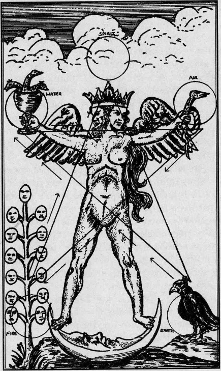 Если на этот глубочайший алхимический символ спроецировать пентаграмму (см. ил. 15), знаки стихий Великого Делания окажутся расположенными в правильном порядке применения и проявления. Начиная с нижнего правого угла, они следуют в таком порядке: Земля (чёрный ворон или ворона); Вода (чаша, в которой растворяются все три принципа); Воздух (душа-уроборос) и Огонь (принцип роста, алхимическое древо). Пентаграмма завершается в точке, соответствующей короне Андрогина, представляюшей пятый элемент – Эфир, Универсальный Дух или Квинтэссенцию.