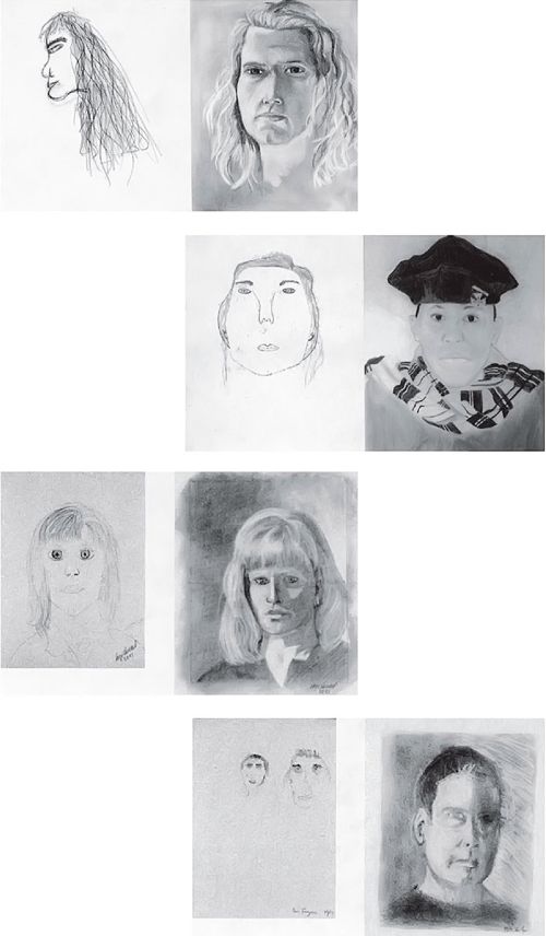 Не буду расписывать степень моей неловкости и жалкое качество моего произведения искусства, хотя и то и другое было мучительно очевидным. Всю эту историю я рассказываю для того, чтобы подчеркнуть удивление и радость от книги «Открой в себе художника» 91. Ниже представлены автопортреты участников тренинга, проведенного его автором Бетти Эдвардс. Один – нарисованный учеником в начале курса, второй – по окончании учебы, пять дней спустя.