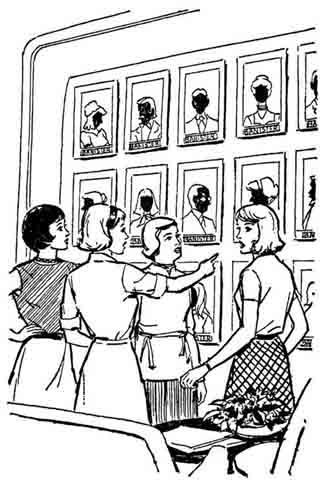 Миссис Кэрриер и девушки отскочили назад и стали ждать, что же окажется по ту сторону. К их крайнему изумлению, там не было книжных полок. Вместо этого на круглой стене висело более дюжины портретов в золотых рамах.