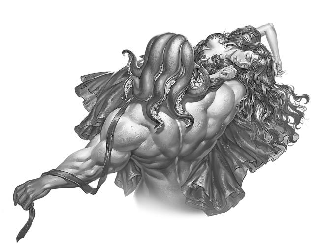 Он резко замирает. Вернее, человеческие части тела: рельефный торс, мускулистые руки и лицо с безразличным выражением. Щупальца, которые заменяют ему волосы, скользят по плечам, а нижняя часть тела, также состоящая из щупалец, движется и извивается.