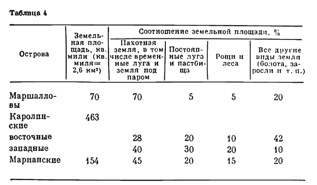 Острым на островах является земельный вопрос. Земли мало. Островки крохотные, и к тому же не вся их площадь может быть использована для нужд земледелия. Нижеприведенная таблица иллюстрирует положение, существовавшее на подопечной территории.