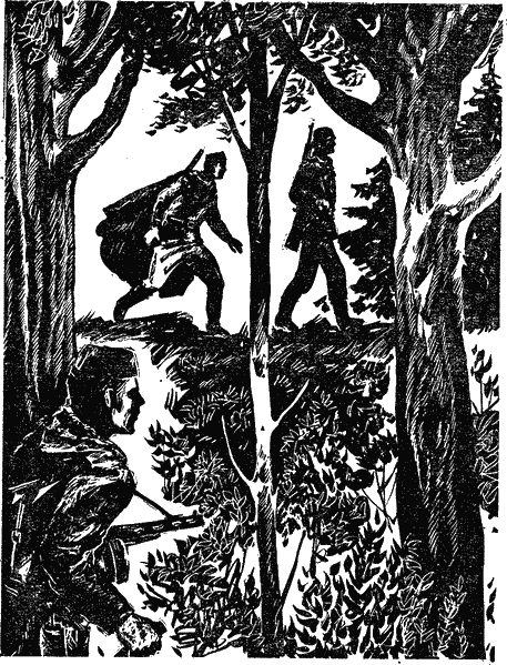 К избушке мы не пошли, а, таясь, обогнули ее лесом, чтобы посмотреть, не идут ли следы через полянку, на которой стоял домик, снова в лес.