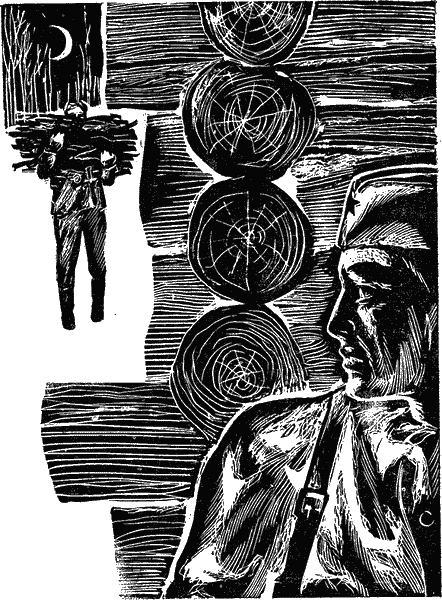 Стали прислушиваться, и нам почудились какая-то возня и шорохи в избушке. Терпеливо стояли по обоим сторонам двери, ждали и слушали… Ждали около часа, а может, и больше. Ноги прямо-таки затекли от неподвижности. Я уже подумывал отойти в лес, как неожиданно раздались шаги. Кто-то тихо, крадучись, изнутри приблизился к двери. Постоял, вроде прислушиваясь, осторожно отодвинул засов. Открылась дверь, и на пороге показалась фигура человека. Он осмотрелся, пошел к куче хвороста, лежащей около дома. Я растерялся: смотрю и ничего не предпринимаю.