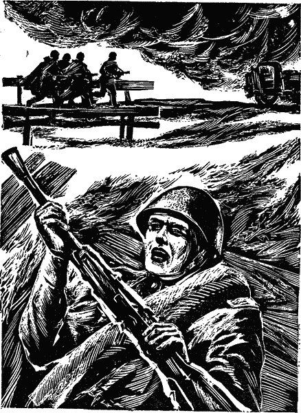 В это время на дороге к мосту показались несколько автомашин с пехотой противника. Немцы, вероятно, уже догадались, что у нас только личное оружие, и поэтому, не доезжая до моста метров четыреста, их автомашины остановились, из кузовов высыпали солдаты, на ходу разбегаясь в цепь. Они пошли на нас, чуть пригибаясь и стреляя короткими очередями.