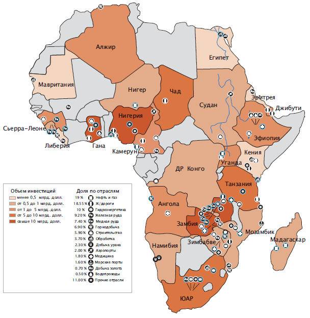 Кроме того, китайцы вовсе не ограничивают свои инвестиции сферой разработки полезных ископаемых, как это традиционно делали европейцы. Китайские компании всячески подчёркивают своё отличие от белых колониалистов, веками эксплуатировавших природные богатства региона. Чтобы доказать это, КНР инвестирует в масштабные инфраструктурные проекты: строительство дорог, портов, гидроэлектростанций, сетей фиксированной и мобильной телефонной связи, социальных объектов. Кажется, скоро в Африке не останется ни одной столицы, где на средства Китая не построен гигантский стадион или не проложены шоссе. Это позволяет Поднебесной выстраивать значительно более позитивный имидж, чем странам ЕС и США, закоренелым империалистам в глазах любого африканца. Однако природные ресурсы, конечно, КНР при этом далеко не отвергает: 20 % всех китайских инвестиций направляется в сферу добычи и транспортировки нефти и газа, ещё 25 % – в разработку месторождений железной и медной руды, других полезных ископаемых. До 2015 г. китайские компании вложили в Африку не менее 100 млрд долл., но только в одном этом 2015 г. планируются инвестиции в 50 млрд долл. Помимо минеральных ресурсов, это позволит КНР пристраивать миллионы собственных рабочих на строительстве объектов в Африке. Многие из них поселятся впоследствии в африканских городах, формируя китайские диаспоры.
