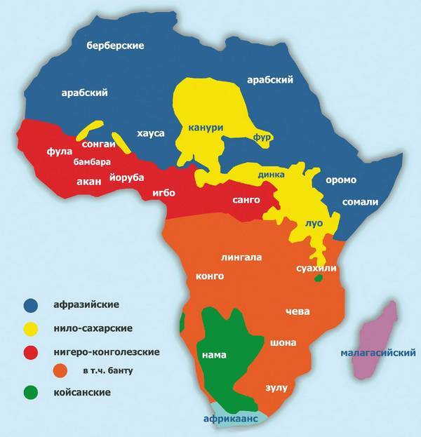 Безусловно, в Африке существуют и крупные языки, которыми пользуются миллионы и десятки миллионов людей. Но, в отличие от Европы или Азии, их весьма немного. Это, конечно, связано с тем, что на большей части континента долгое время не существовало ни крупных государств, объединяющих своих подданных единой языковой нормой, ни литературной традиции. Распространение языков шло преимущественно за счёт развития торговли. Так завоевал популярность язык суахили в Восточной Африке. Сегодня этот «торговый язык» используется в 14 странах, им владеют не меньше 30 млн человек.